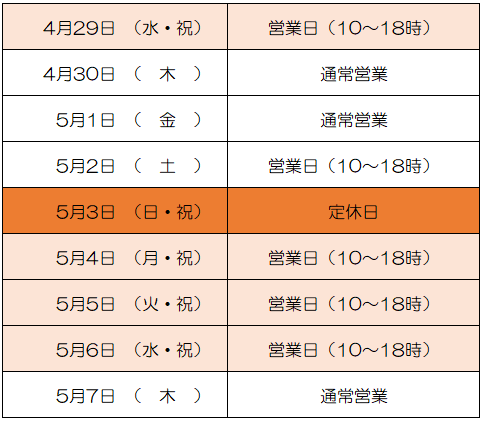 ゴールデンウィーク期間中の営業は以下の通りとなります。