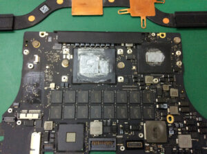 中央付近の灰色に見える四角い部分がCPU、右側にある似たような部分がGPU(グラフィックチップ)です。