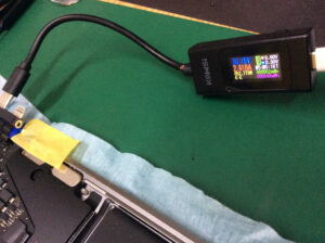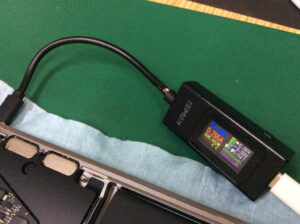 このモデルはUSBボードの入替時にロジックボードなどを取り外す必要があるため、検証作業ではUSBボードをロジックボードに仮取付し電流計測器を接続して通電させました。
