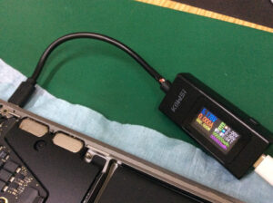 ただUSB-Cボード周辺に腐食痕のような物があり、通電テストでは2つあるポートの片方は通電しないかUSB端子電圧のみ、もう片方は一瞬本体電圧がかかるもののすぐにUSB端子電圧だけになるか断線します。