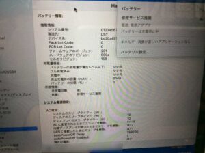 バッテリーはステータス上の容量や充放電回数などに問題は無さそうでしたが、修理サービス推奨のメッセージが出ています。