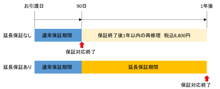 延長保証を付けない場合は他の修理保証と同様90日間の保証となりますが、保証期間が過ぎた後、お引渡日から1年以内の再修理は税込8,800円にて対応致します。